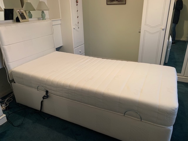 As new custom made single electric mobility bed by Oaktree Mobility. Memory mattress Poplar collection. 3Ft wide, 6ft long. Silver Damask material.