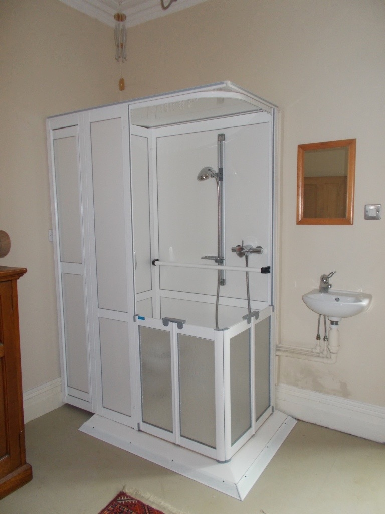 Accessible combined shower / wc cubicle including ramped access shower tray in very good used condition plus hand basin