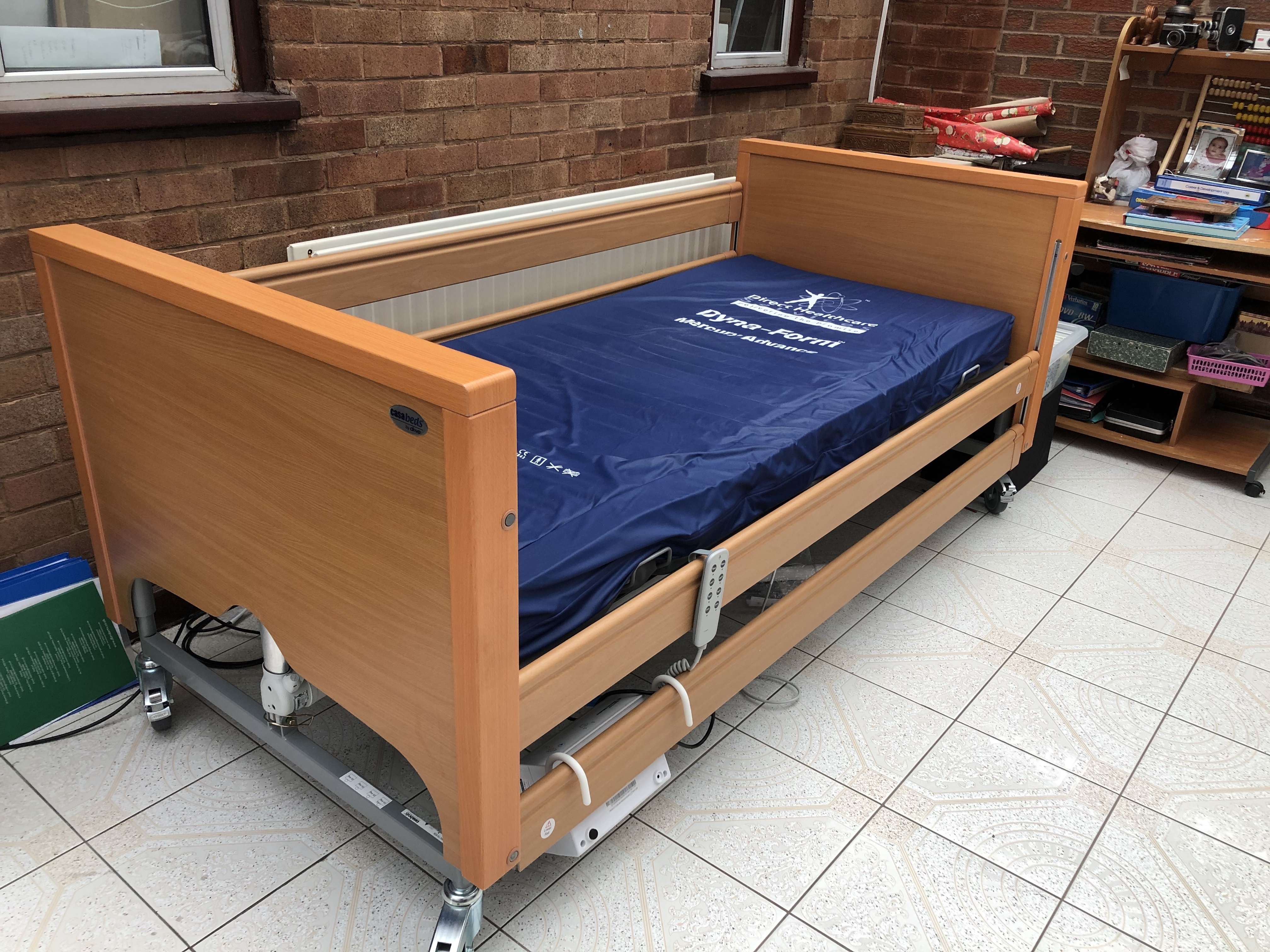 Excellent condition no scratches or marks on the bed - looks brand new - Pine Tan Wood adjustable electric mobility bed (Purchased in April 2018 £754) with Air Mattress (Dyna-Form Mercury Advance). Mattress cost when purchased £299.00 April 2018.