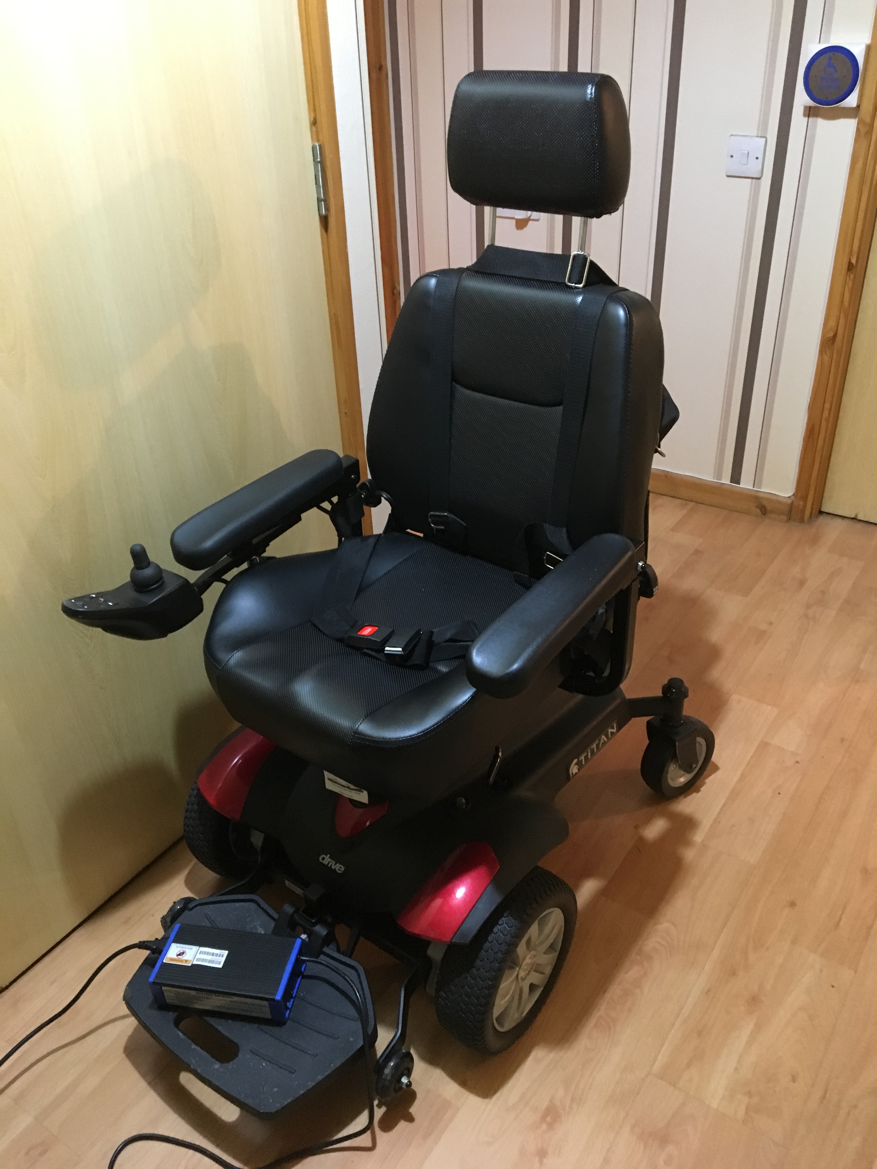 Titan Drive electric power wheelchair complete with charging unit and detachable shopping bag.