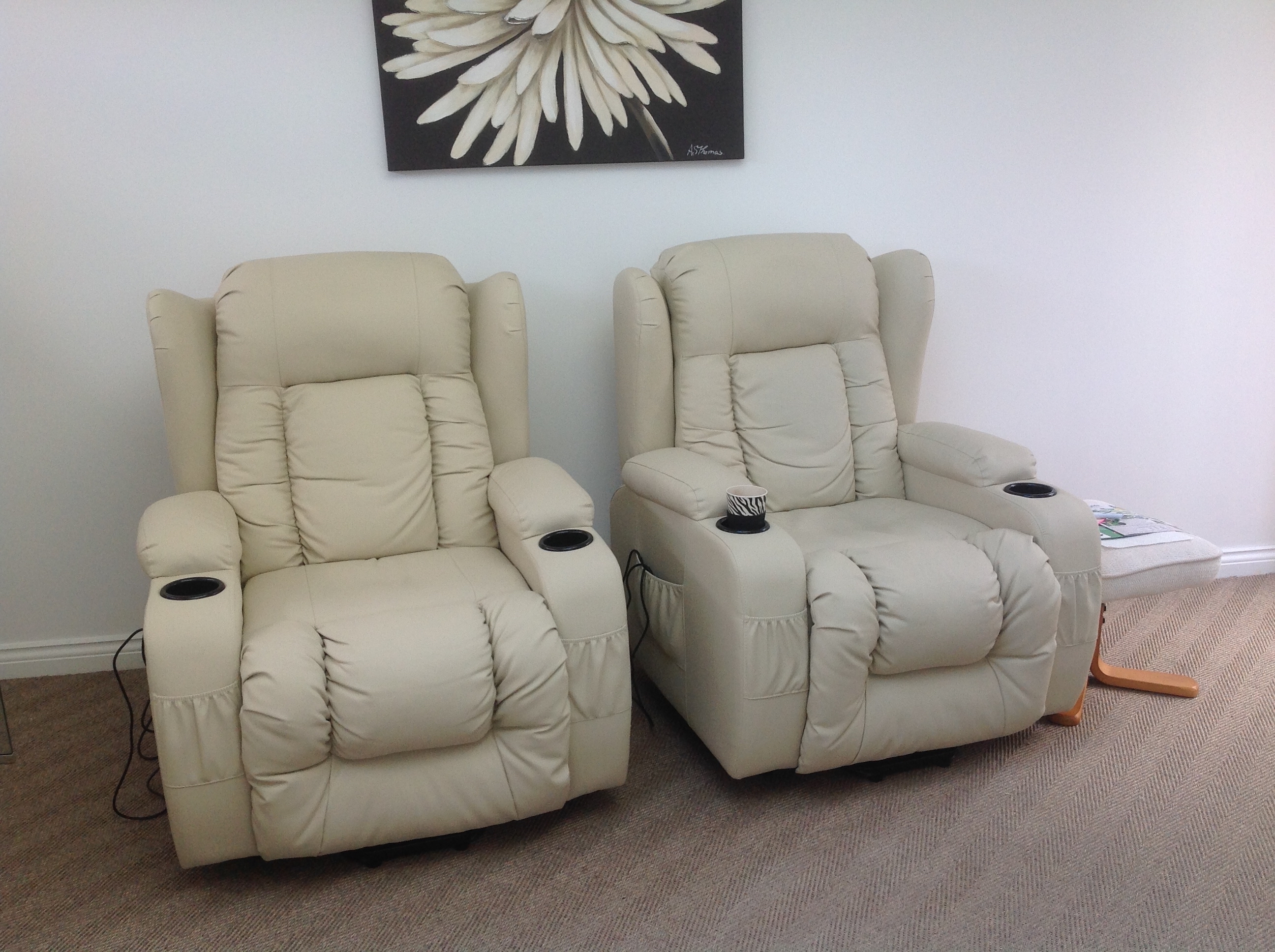 Two Rockingham Riser/Recliner armchairs with heat & massage in cream leather. Recently purchased for £640 will sell for £175 for both for quick sale. They are both in excellent condition as they are only two months old. |