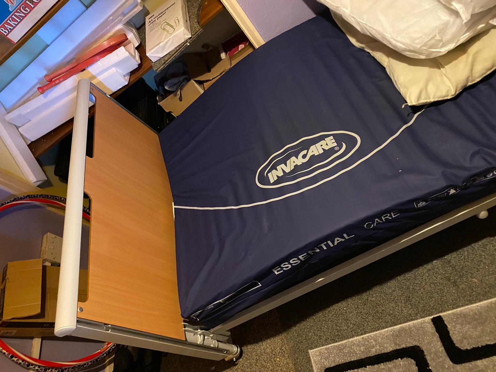 Nearly new Invacare Etude Plus low profiling bed with Essential care matress. (bought in September 2020 for £700) Height adjustable with lockable hand control. Raise or lower head or feet individually by remote control.