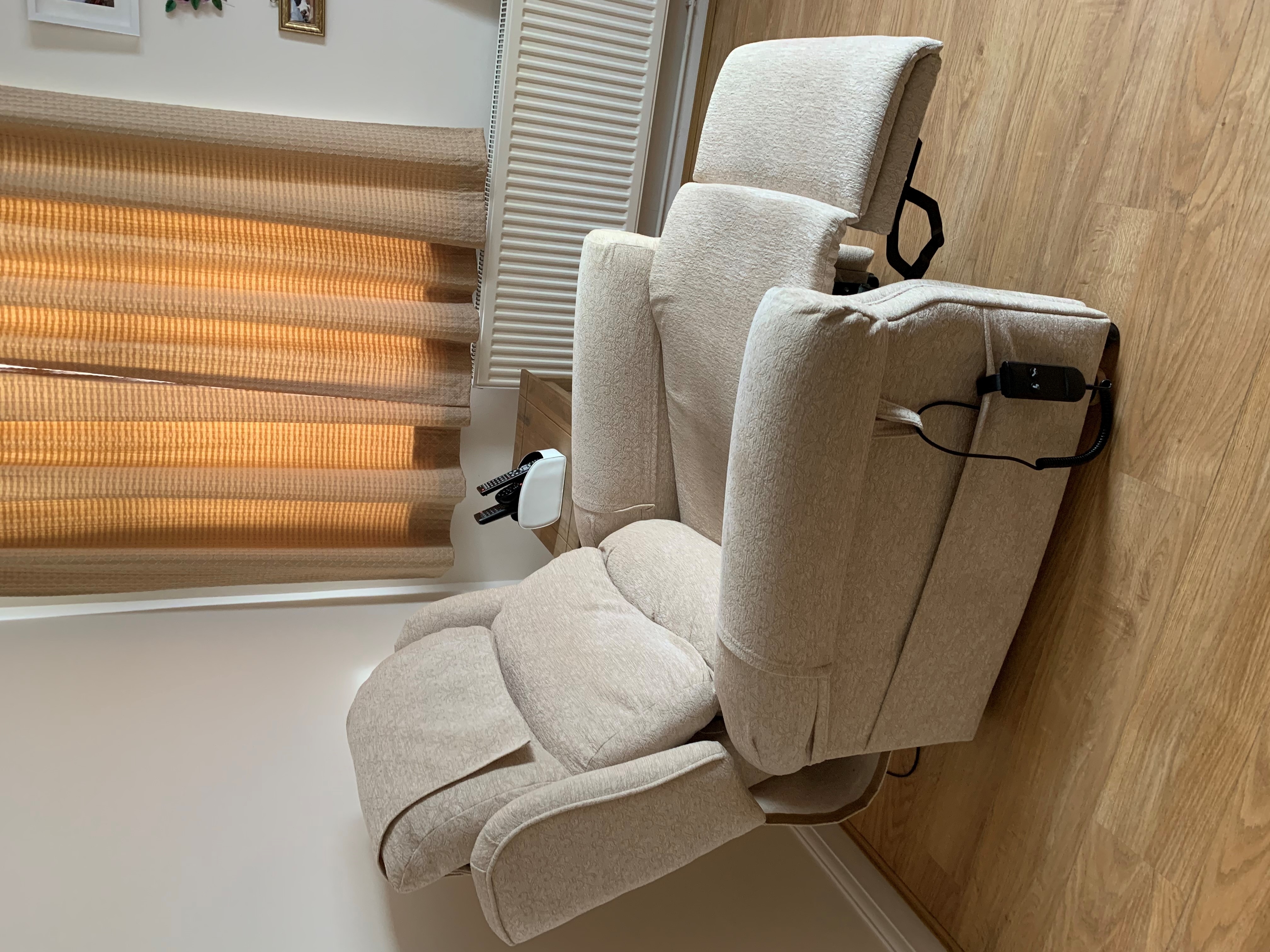 Purchased from The Mobility Furniture Company and finished to a high standard. Neutral ivory colour. The seat raises and tilts to allow easier standing. The back reclines and leg rest lifts up. Includes arm covers and antimacassar. Buy to collect from Benfleet, Essex. |