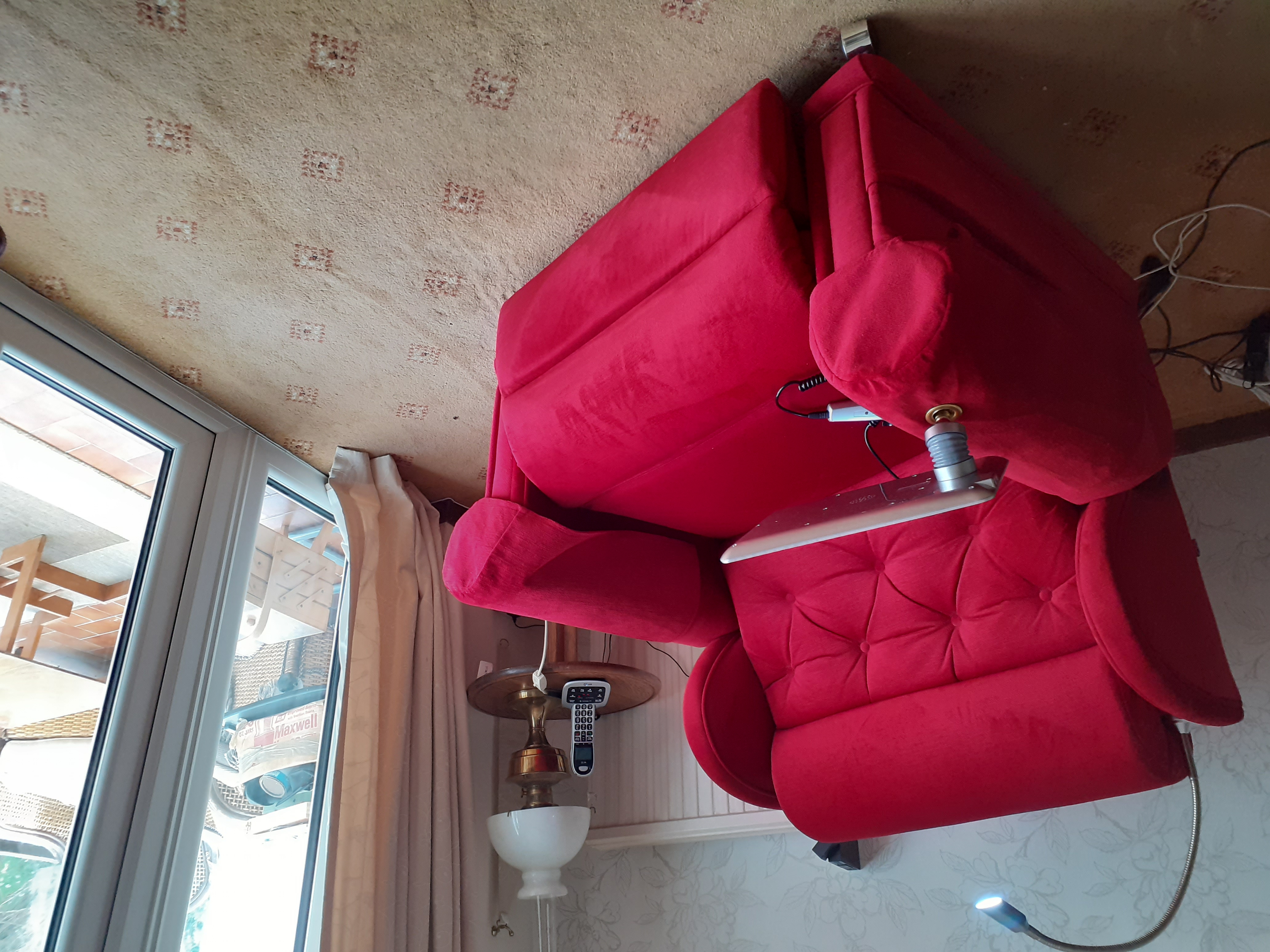 Recently bought for £3000, bespokely ordered, now no longer needed, beautiful bright red colour, has back up battery, over chair light, slot in tablet rest for devices, usb connection for charging extra devices and arm covers.