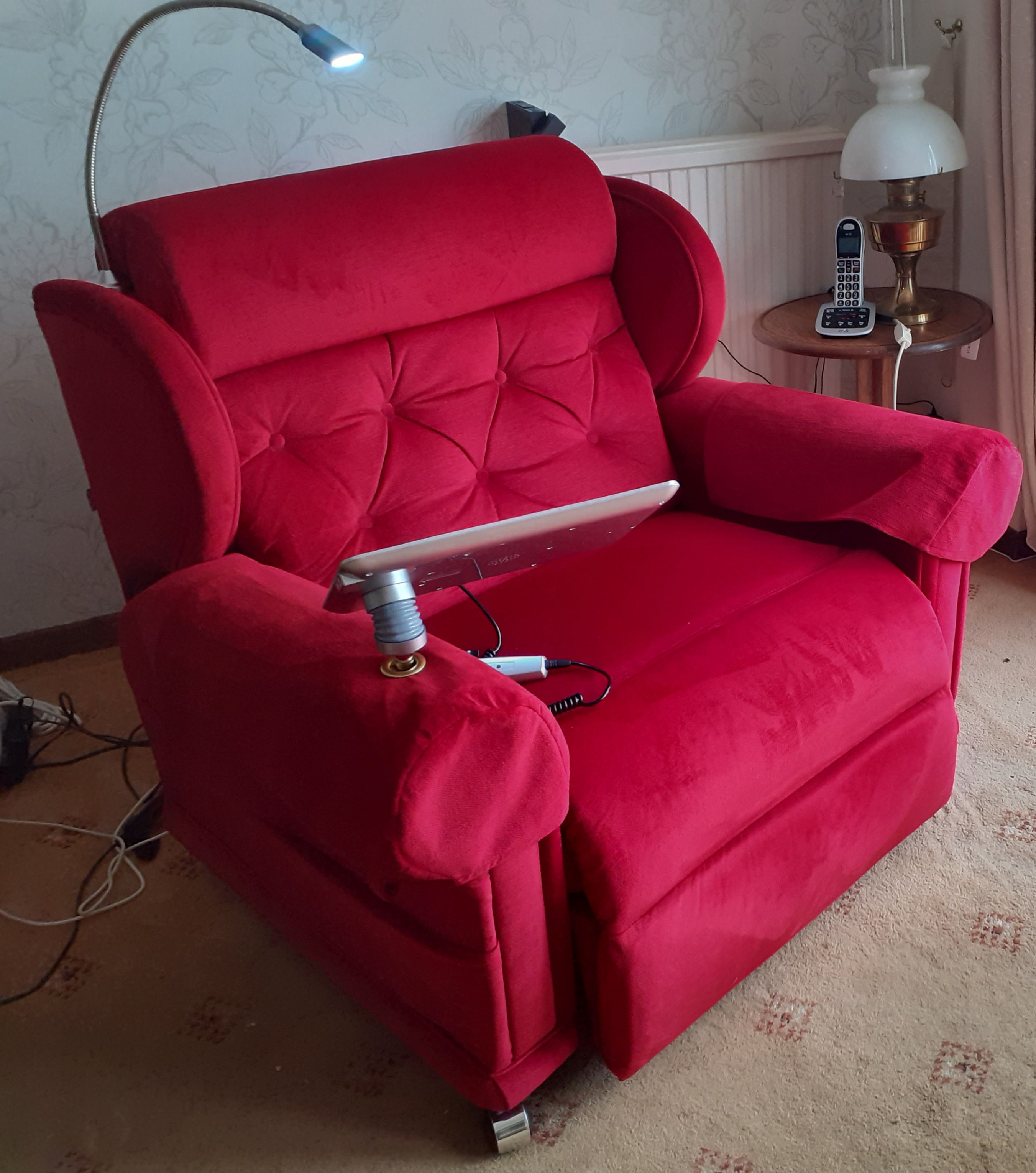 Recently bought for £3000, bespokely ordered, now no longer needed, beautiful bright red colour, has back up battery, over chair light, slot in tablet rest for devices, usb connection for charging extra devices and arm covers |