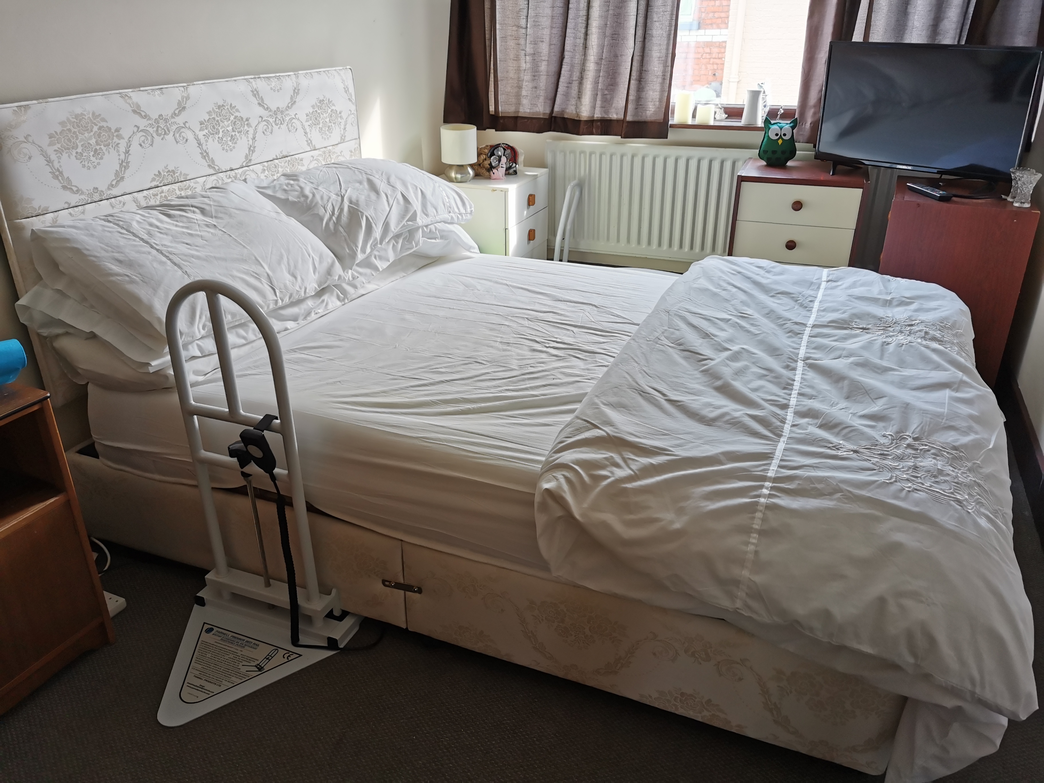 Double adjustable electric bed for sale, comes with grab rail and headboard.