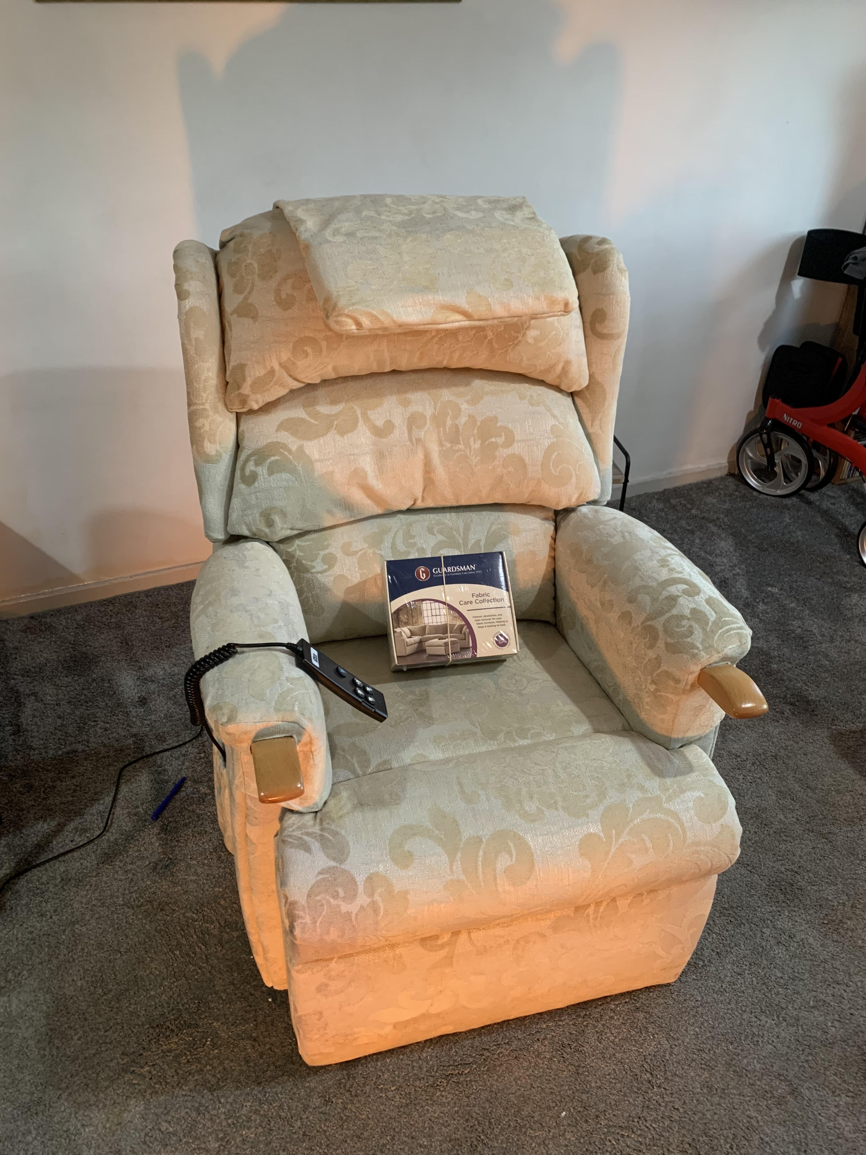 A standard size HSL Aysgarth Dual Motor Riser Recliner Chair. Comes with Beech wood knuckles and Windsor floral natural fabric. Also included are fabric arm caps, head rest, extra seat cover and an unopened fabric cleaning kit. Pockets and controller are positioned at right hand side of chair. Originally cost over £2000 and is only 3 months old. |