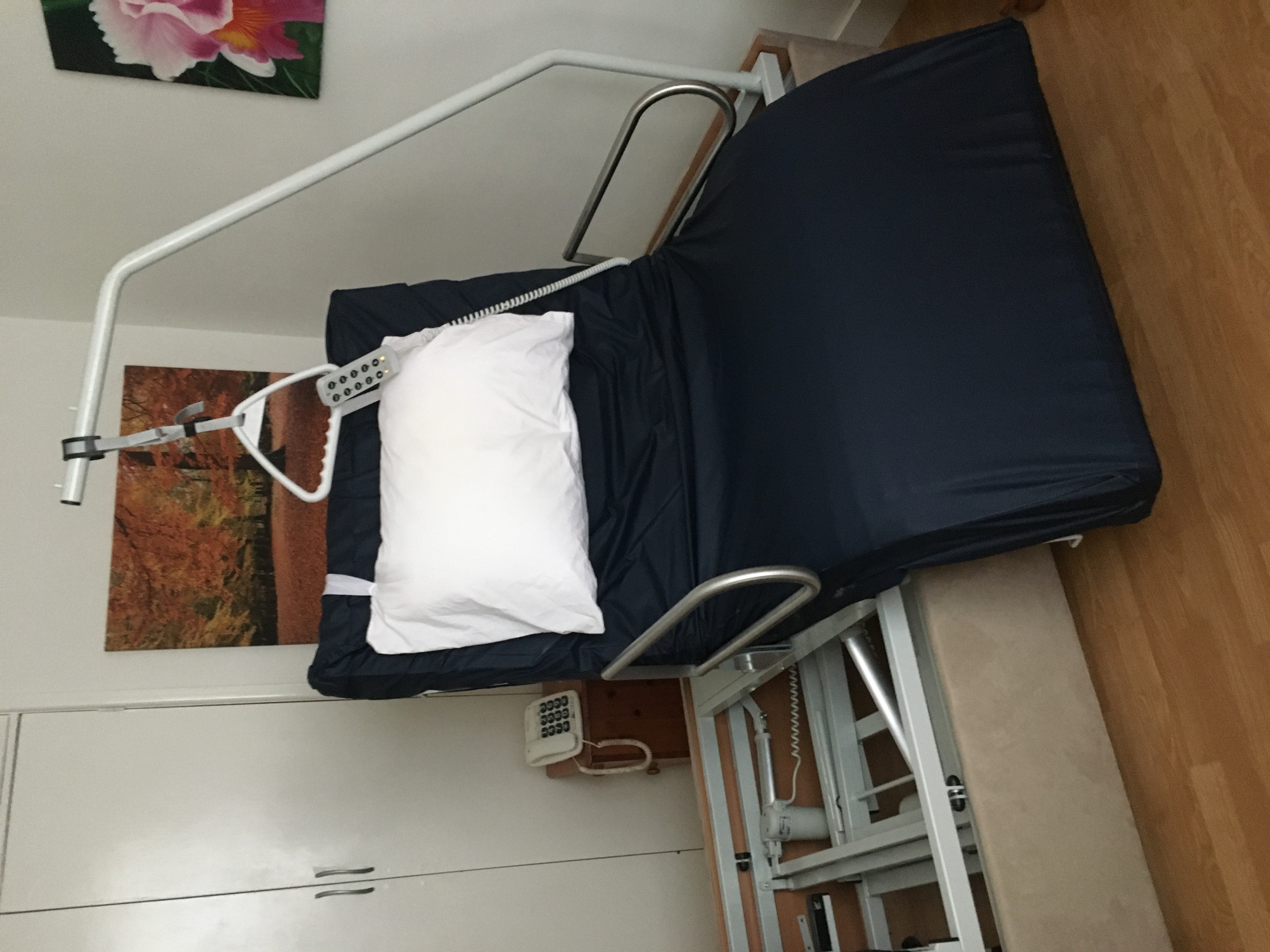 Electric turning bed - goes from flat to full rise using one button. Looks like a standard bed when flat. Complete with pressure relieving mattress, spare hand control, hoist attachment. Approx £8,000.00 new - little used . Original supplier will dismantle and deliver and reassemble within twenty mile radius for £595 plus £1.75 per extra mile. |