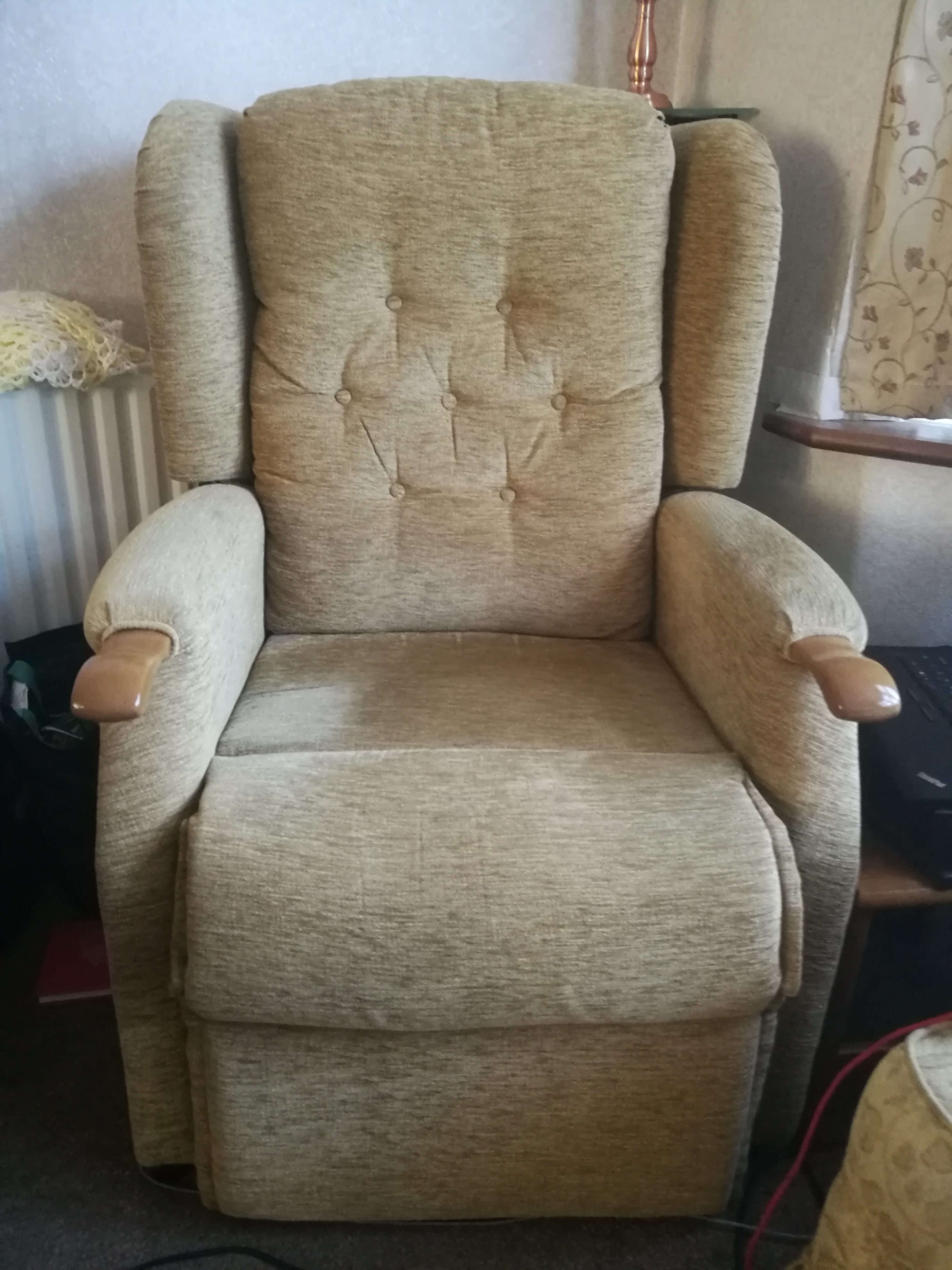 High quality riser recliner chair from Oakland Mobility, made to order. Purchased 18 months ago, has had 8 months light use. Clean. In perfect working condition, quiet. Comfortable. Fabric is 'Conniston Plain Saffron'. Cedar Collection, button back, high leg lift. Original cost £4250. Viewing welcome. Original bill of sale and particulars can be seen. Non-smoking home. No pets on chair. For sale as my father has moved permanently to a nursing home and does not want it. No stains or marks. No 'accidents'. Almost new condition. Wooden handholds. Pockets. Handheld remote control. Plugs into 13A socket. Original 10 year warranty from end November 2020. Detachable headrest cushion. Partner chair available. |