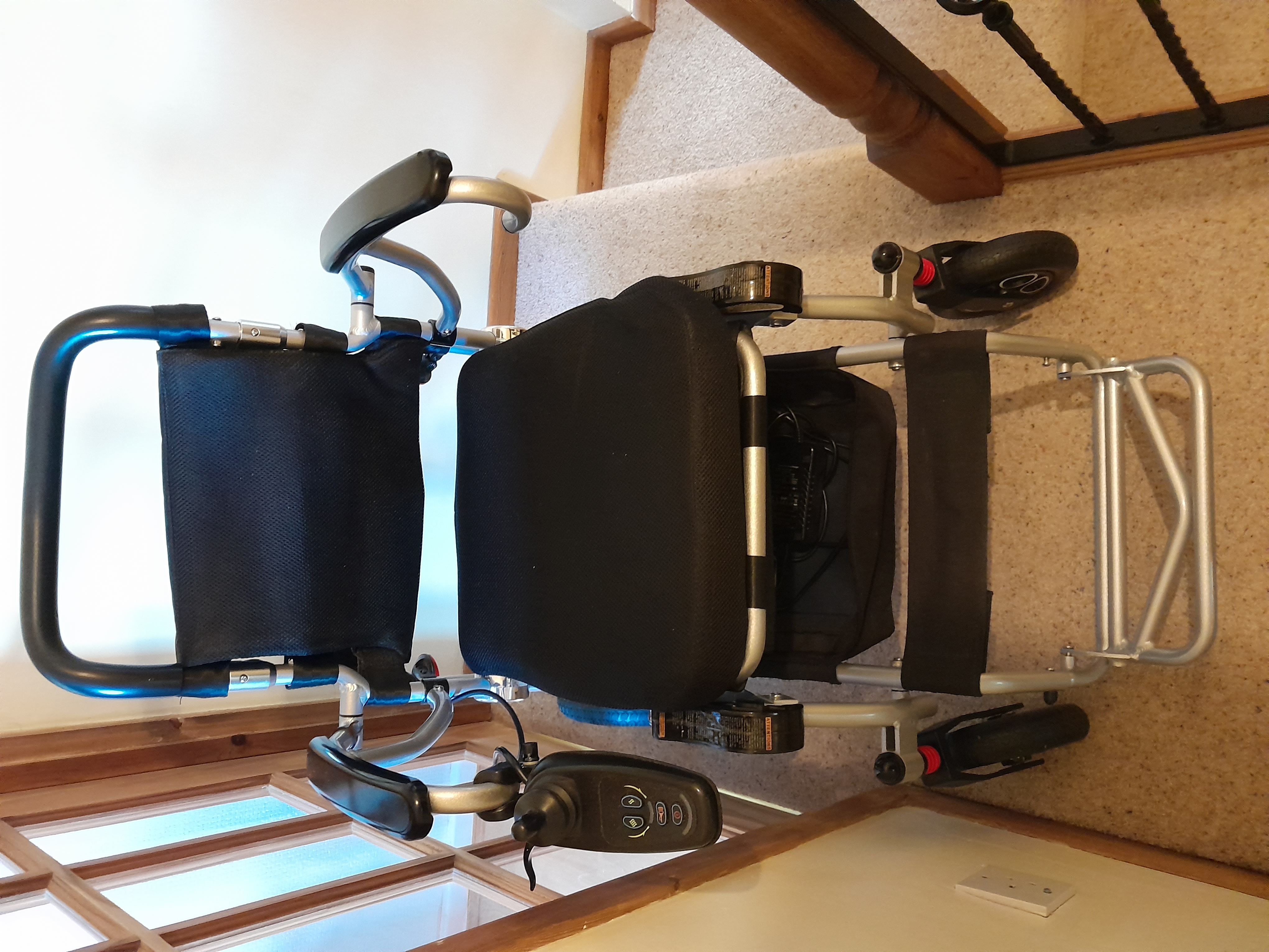 Folding Lithium powered wheelchair which will easily fit into a family car. Has high torque front suspension, comfortable durable seating and under seat storage.2 rechargeable batteries provide a total of 8 miles on level ground.user friendly LED control system with speed adjustment and horn. Weight capacity 18 stone, max speed of 4mph, length 88cm, width 60cm. This wheelchair has predominantly been used indoors so is in very good condition. |