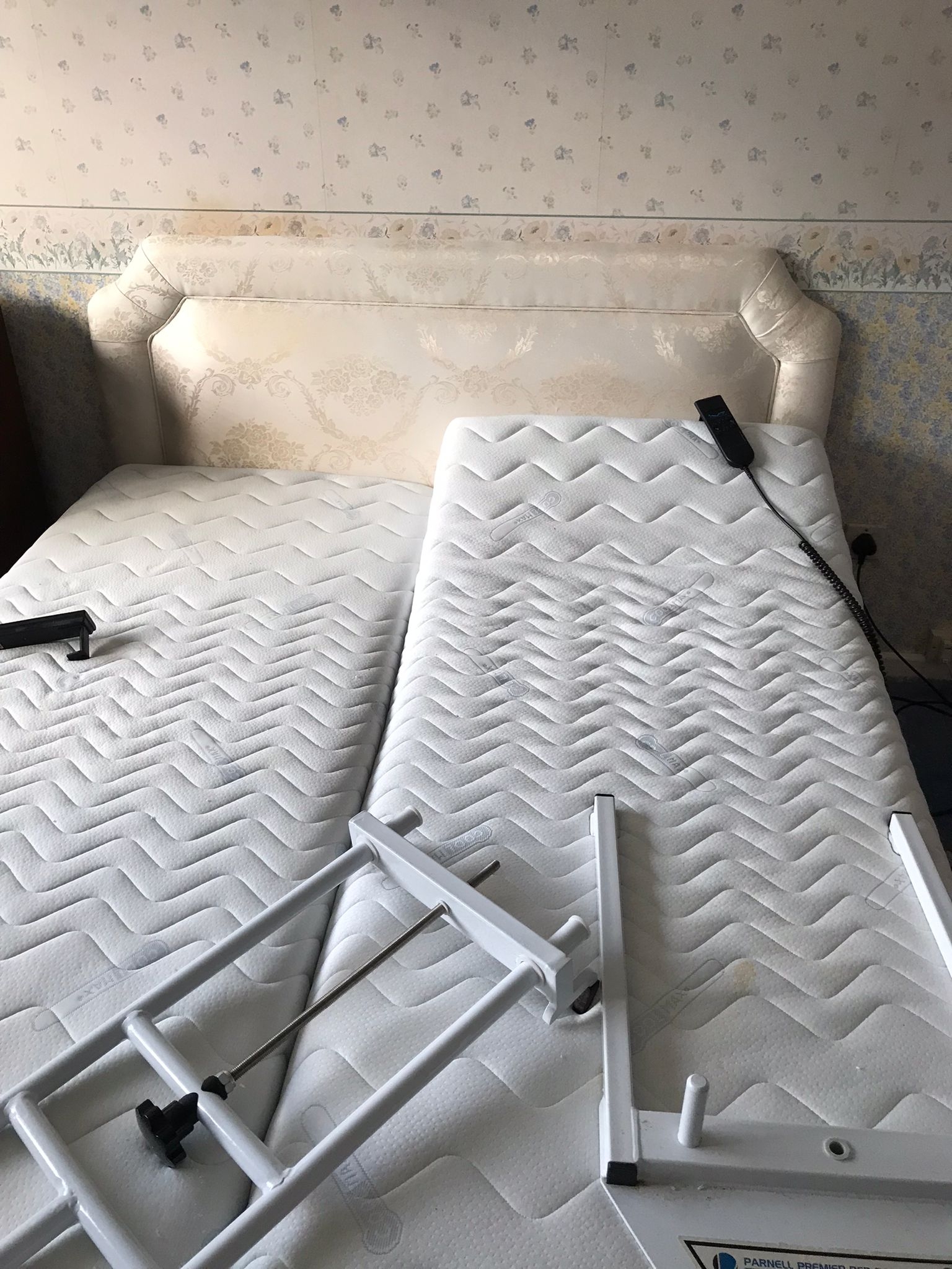 5' wide x 6'6" mattress length (6' 10" total base length) x 20" high; "Lilac" range, in gold damask. With dual controls; Parnell bed rail.