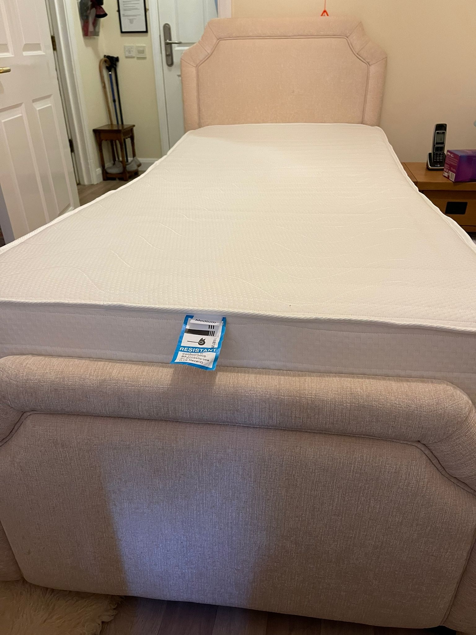 Excellent condition 3ft wide, 6ft6in base length, single natural blarney bed. Mattress memory foam maxi cool, medium firmness. Head and foot raise. Only 4 years old |