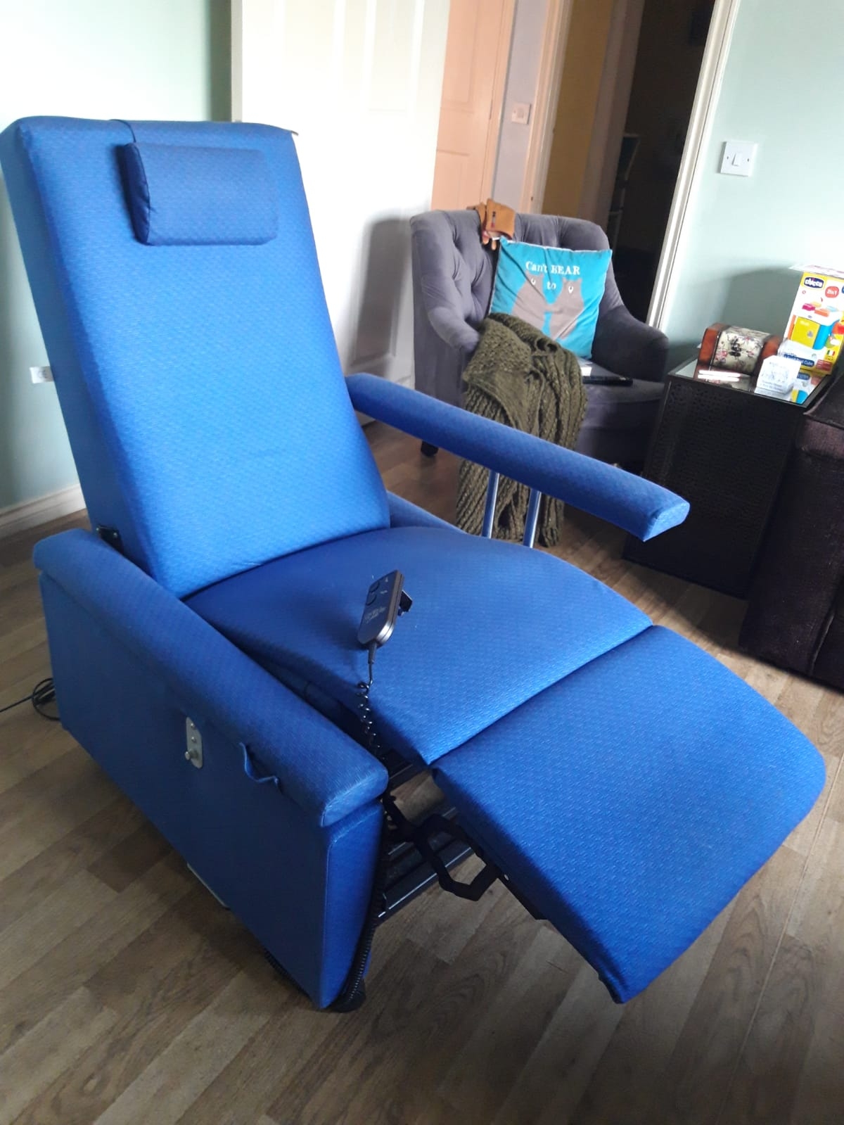Drop arm for easy transfer, full recline and high rise for ease of standing. Immaculate condition, very comfortable |