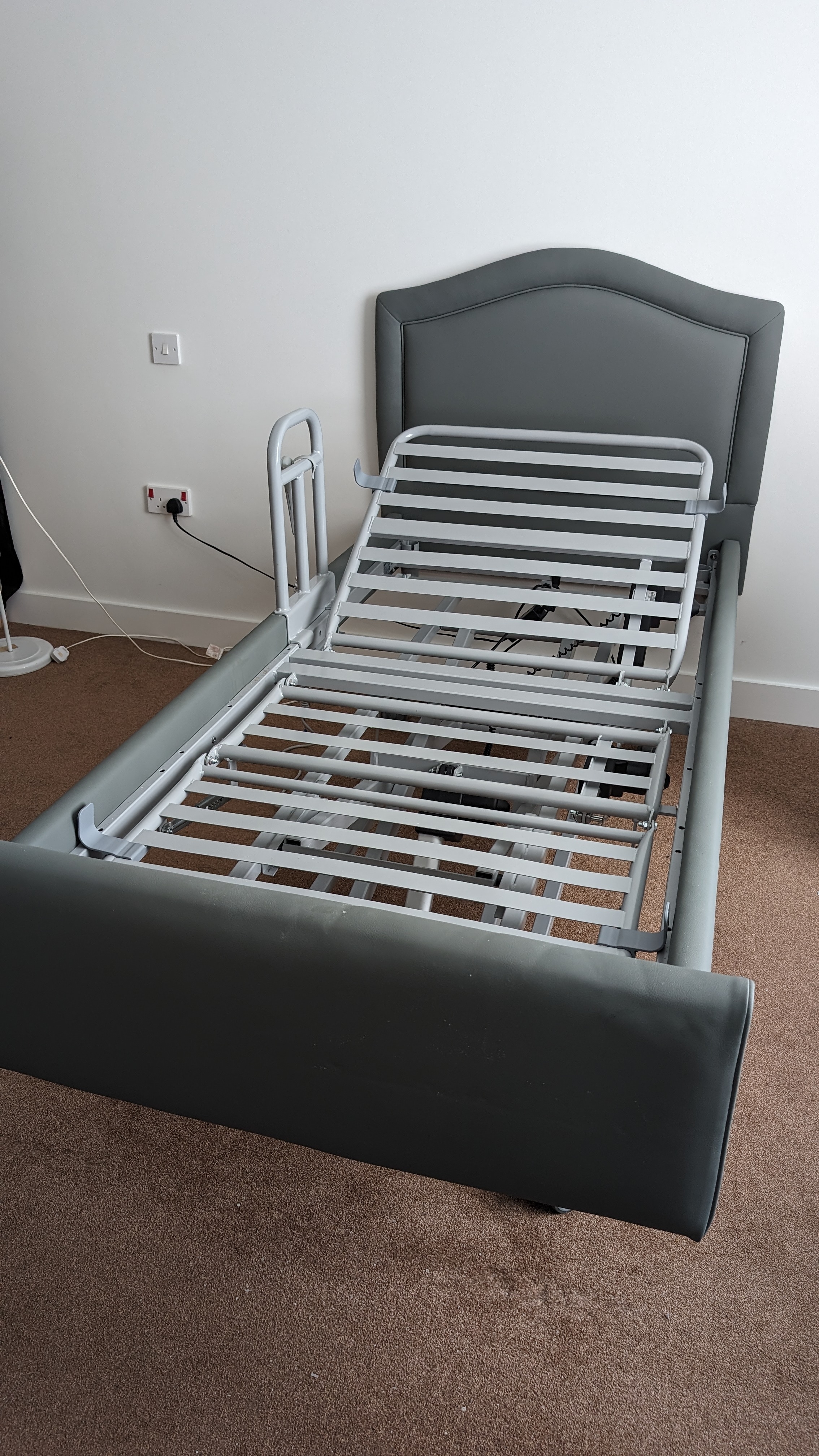 Fully adjustable grey leather opera bed. Less than a year old fully working, great condition. Removable hand rail can be moved to different positions. |
