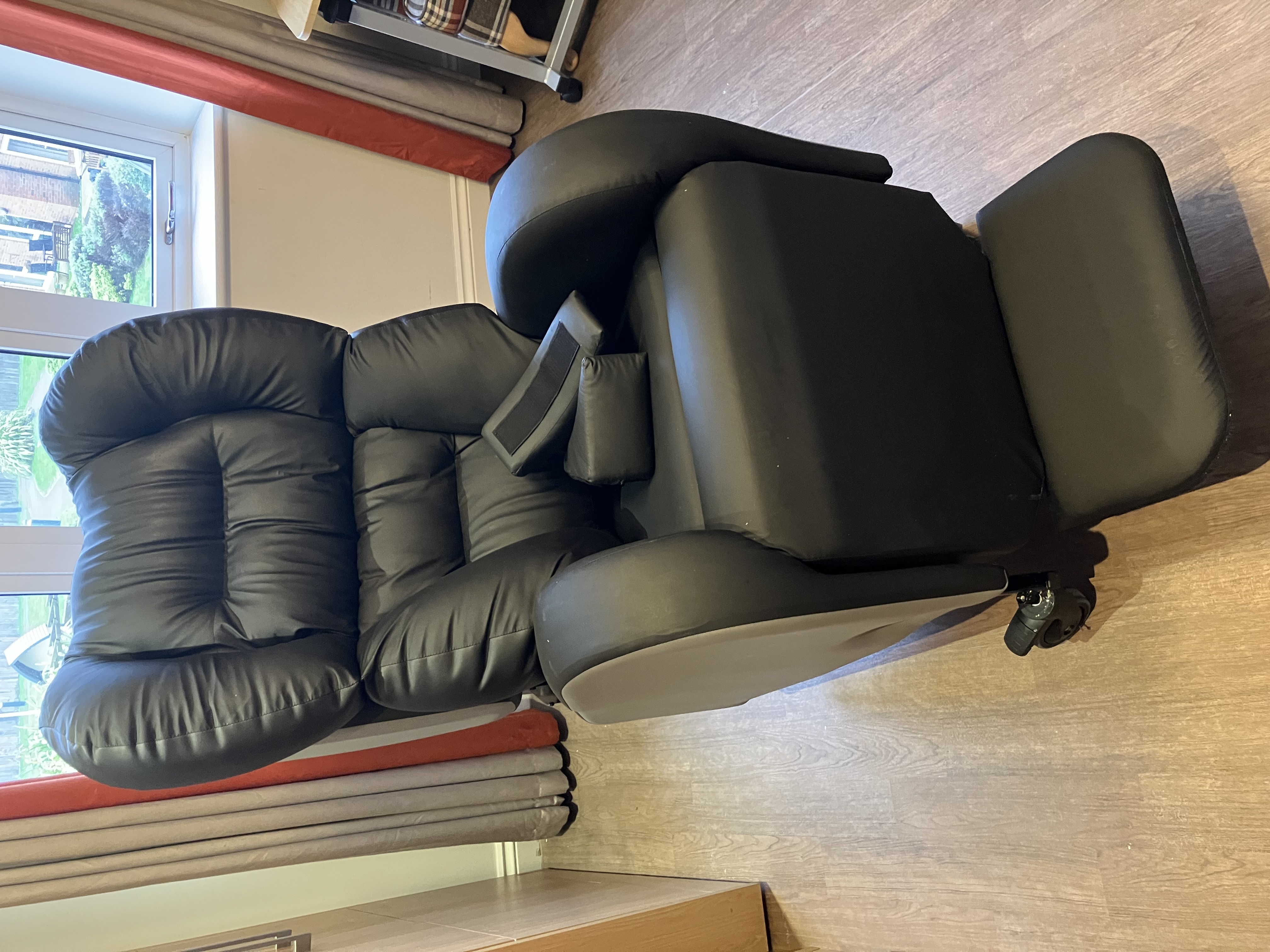 Saros modular chair, manual actuation, tilt in space, butterfly back rest-ultima black and black VP foot plate, standard with receiver bracket. Compatible with hoist, fully reclines with leg rest elevation. Almost brand new owned for 3 weeks. |