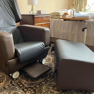 Care Flex hydro care specialist chair for use in nursing environments or in the home for people with limited mobility. Comfortable seating with high level of security for those who are still somewhat ambulant. The chair has a built in pressure management system based on Care Flex’s patented Water Cell Technology in the seat. It stand on castors making it highly manoeuvrable . Pull out foot rest and additional matching foot stool for additional comfort and support. Measurements :- Seat height 40cms width 63 cms . Backrest height 79cms. Overall height 96cms. Footstool 60cms wide height 40cms depth 40cms. Easy clean leather effect material. |