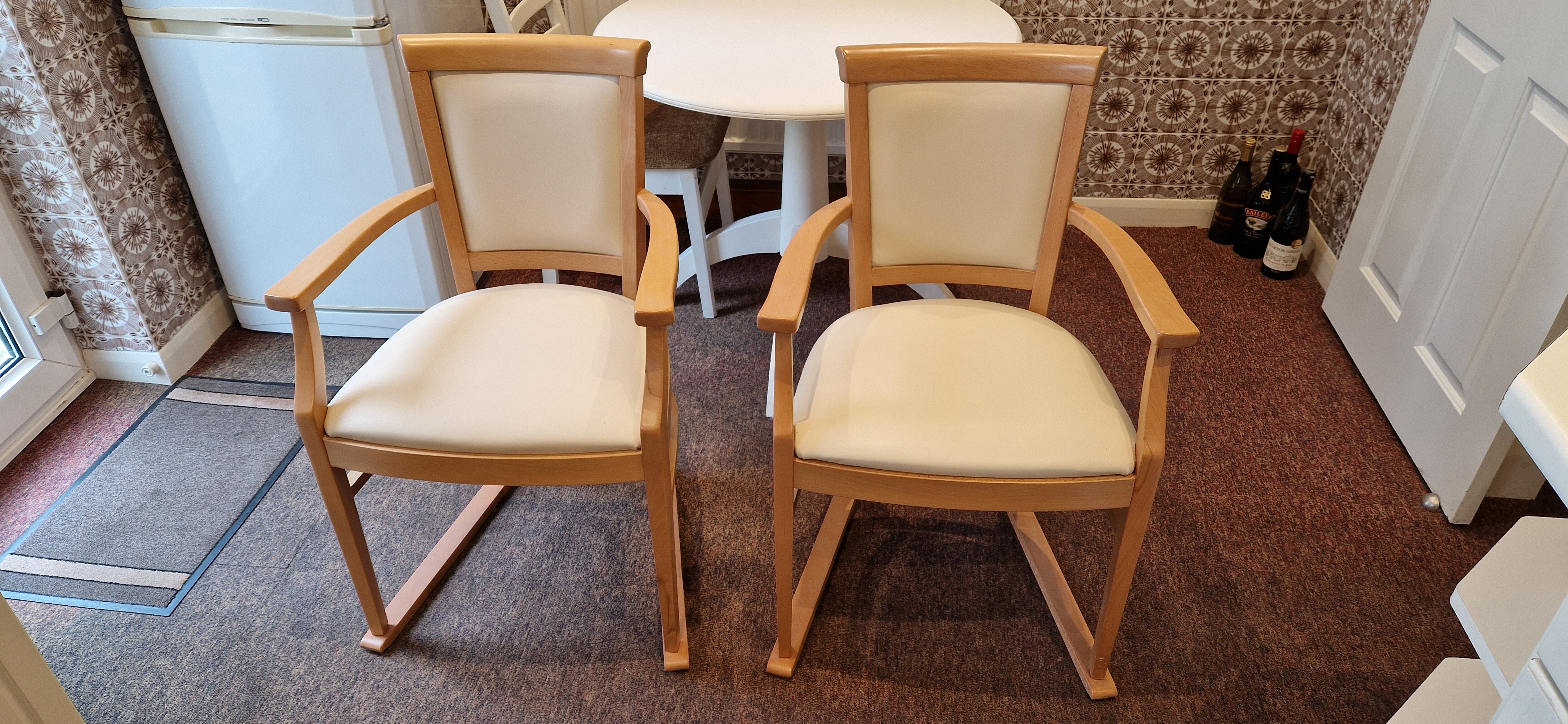 2 dining chairs with skids. made of light wood with unmarked cream coloured pvc padded cushions.