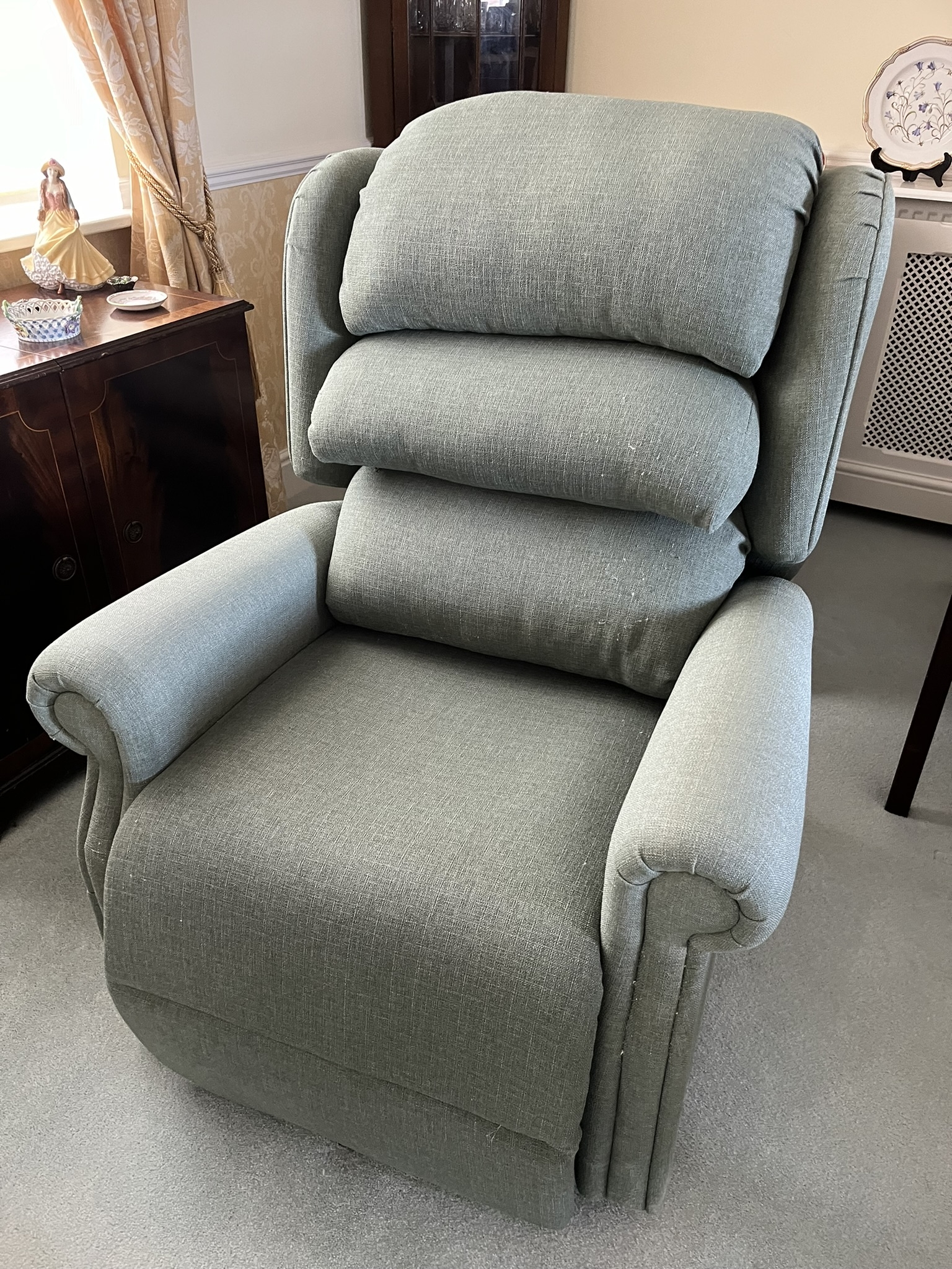 Riser-Recliner in excellent condition. Seating and Back removable. RH side pocket + RH side loop + glides; fabric Highland Stretch 253 Cardamon all over; set of full arm caps. Seat height 16", seat width 20", seat depth 22", weight limit 20 stone. 2 year warranty (frame) expires 10 June 24. |