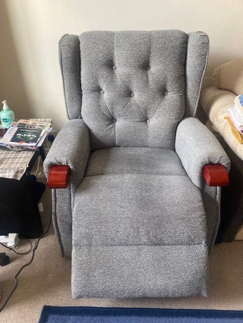 Excellent condition and working order. Simple to operate. Lifts to almost standing position and reclines to almost sleeping position. Backrest and footrest move independently. Textured fabric cover and buttoned back cushion, with wooden hand support. RH side pocket. Measures: Seat height 50cm;seat width 50cm, seat depth 55cm, weight limit 18 stone.Total dimensions H106cm W 83cm D 86cm. |