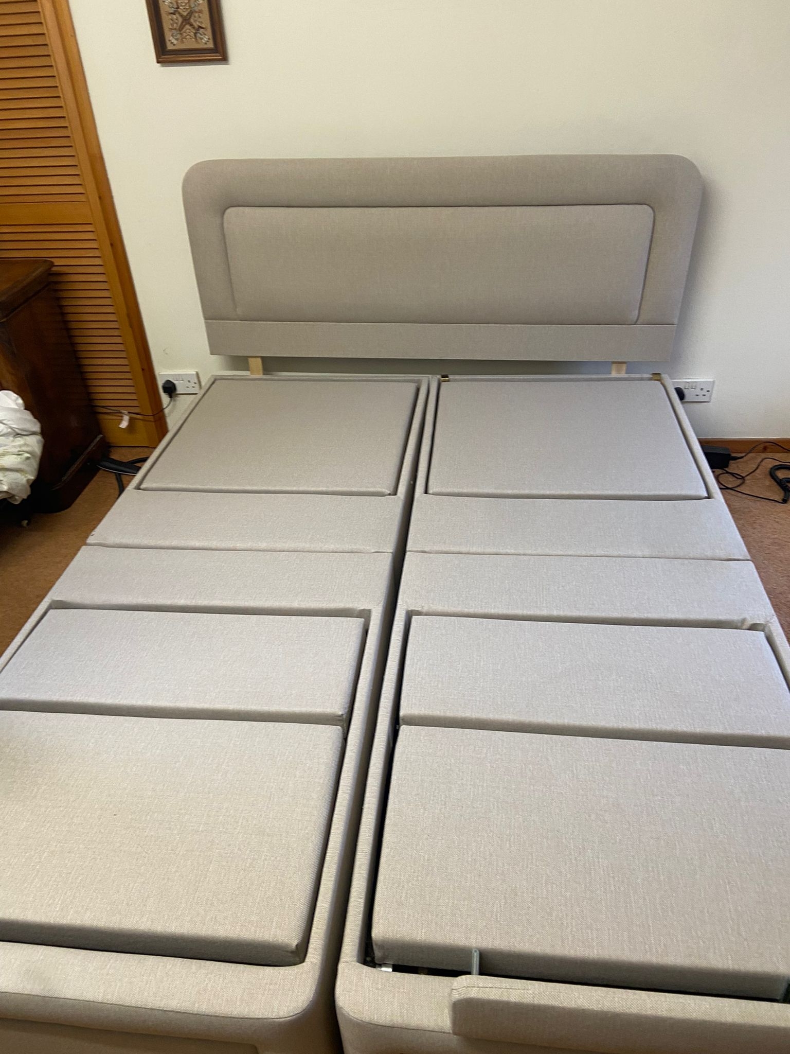 Sherbourne adjustable (electric) bed. 2 x 2'6 wide, with each side independently adjustable. High quality and condition. Headboard included but not mattresses. One unused (still in packaging) set of sheets included. Two separate controllers. Now reduced to £200 for quick uplift East Lothian. |