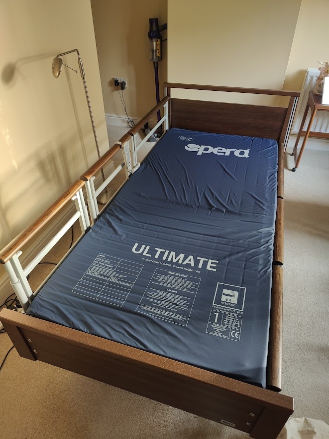 This bed is only a few month old and in very good as new condition. Includes mattress, and side rails in Walnut, and mattress cover everything works. Can be dismantled for transport New cost around £3000 |