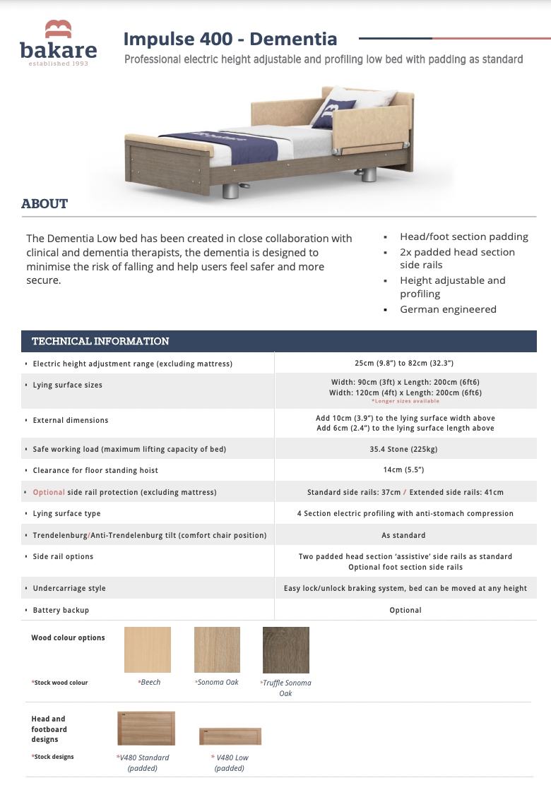 | Description: | The Dementia Low bed has been created in close collaboration with clinical and dementia therapists, the dementia is designed to minimise the risk of falling and help users feel safer and more secure. - Head/foot section padding - 2x padded head section side rails - Height adjustable and profiling Used for 6 months only, in very good condition. Retails for £2895. Collection from Tintagel, Cornwall. Delivery service available, pending courier estimates, buyer pays for delivery. |